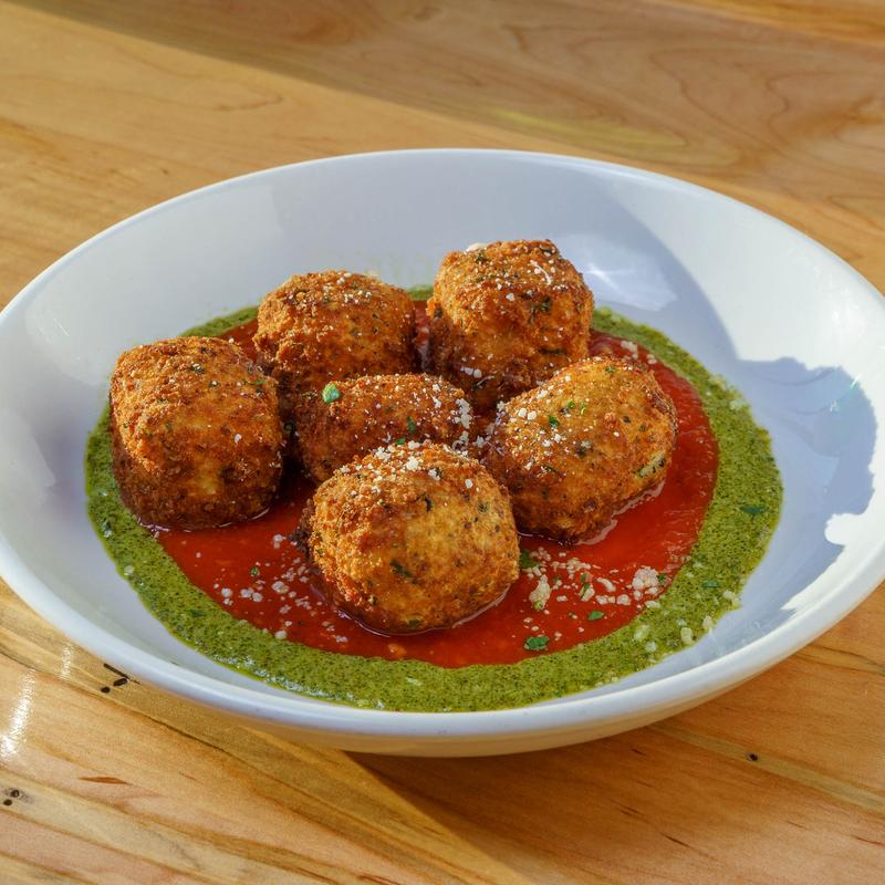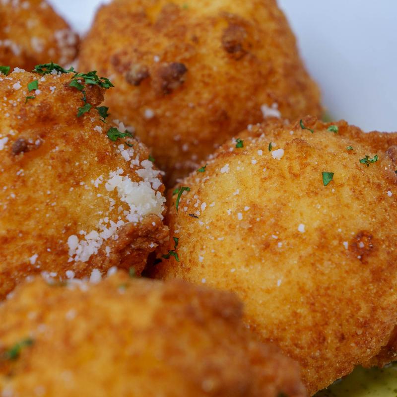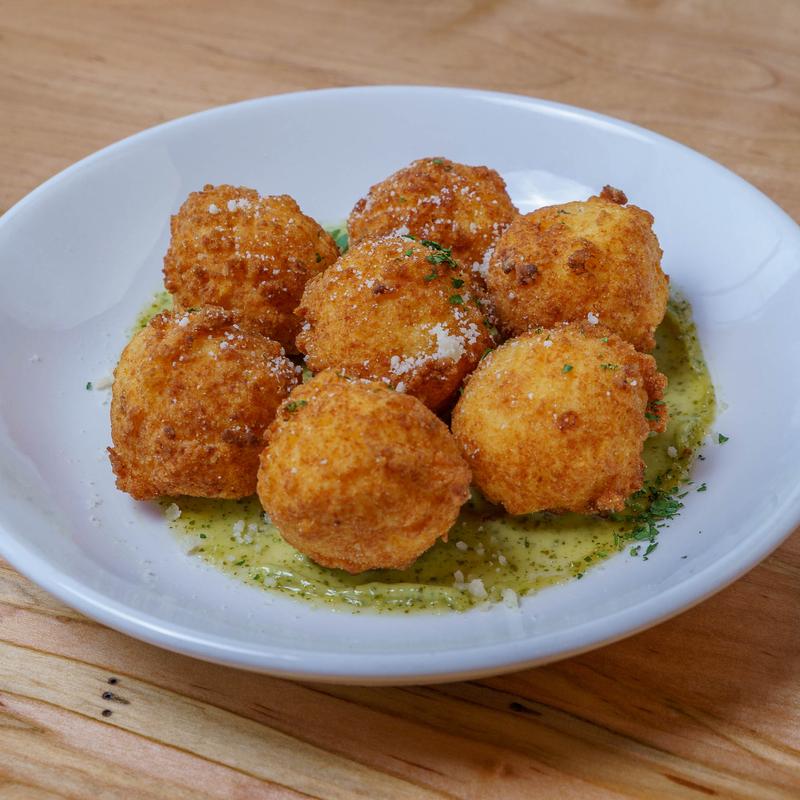 Mascarpone Polenta Fritters, Pesto Aioli, Parmesan