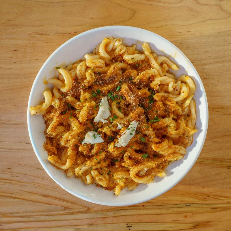 Calabrian Chili, Garlic-Bay Butter, Casarecce Pasta, Focaccia Crumble